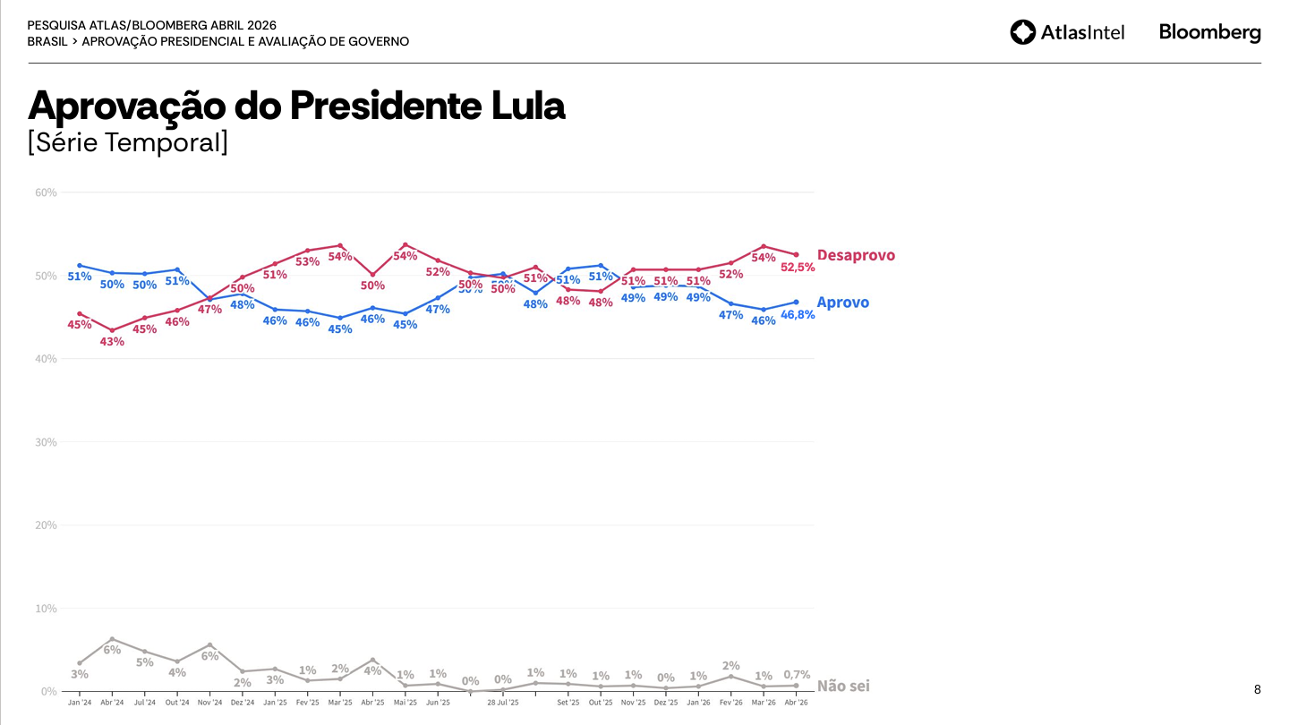 A pesquisa AtlasIntel/Bloomberg ouviu 5.008 pessoas entre os dias 24 e 27 de abril, por meio de questionário digital. A margem de erro é de um ponto percentual, com nível de confiança de 95%. O levantamento está registrado no TSE sob o número BR-07992/2026.