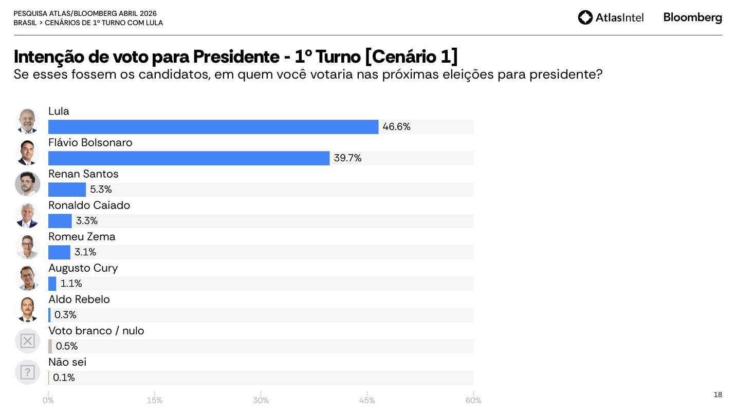 A nova rodada da pesquisa AtlasIntel/Bloomberg, divulgada nesta terça-feira (28), indica que Romeu Zema (Novo) e Ronaldo Caiado (PSD) ampliam presença nos cenários eleitorais, mas ainda sem força suficiente para alterar a dinâmica central da eleição, que segue concentrada entre o presidente Luiz Inácio Lula da Silva e o campo bolsonarista, representado pelo senador Flávio Bolsonaro (PL).