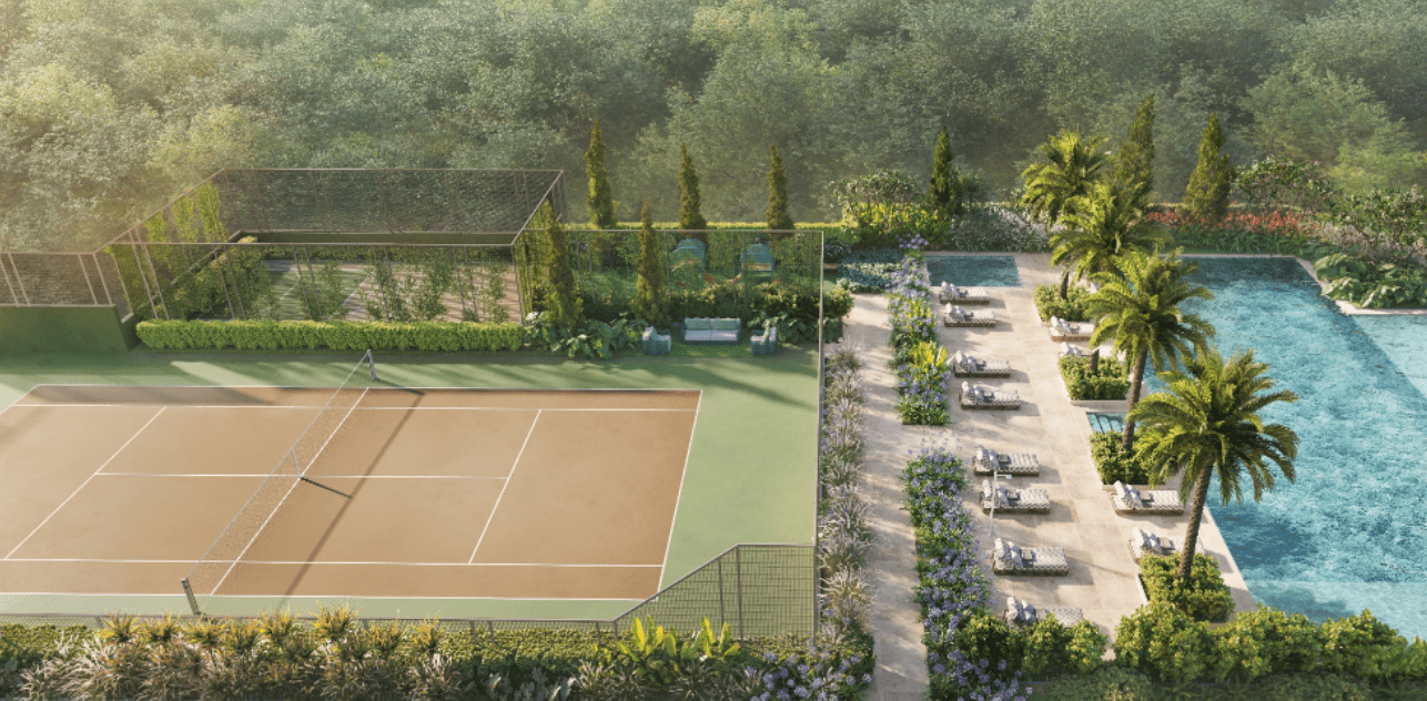 O lazer foi concebido como extensão da experiência residencial e reúne quadra de tênis, quadra recreativa, piscina coberta com raia de 25 metros, piscinas externas, sauna e fitness, em ambientes que mantêm o mesmo rigor estético da arquitetura.