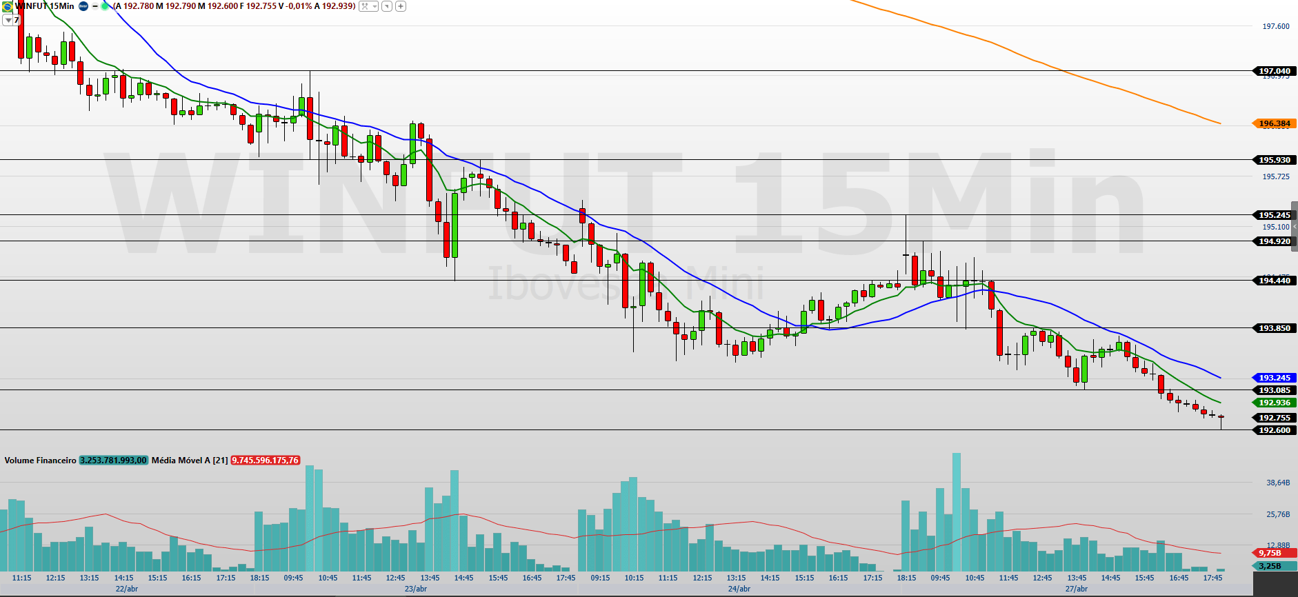Os contratos de mini-índice (WINM26) encerraram a última sessão (27/04) em queda de 0,90%, aos 192.755 pontos, marcando a quarta baixa consecutiva e reforçando o fluxo vendedor no curto prazo. O Ibovespa aprofundou o movimento de baixa e encerrou aos 189.578 pontos, registrando a quarta queda consecutiva em um ambiente de elevada incerteza no cenário externo. No exterior, os mercados operaram de forma mista, ainda sem definição clara sobre o conflito no Oriente Médio, enquanto o petróleo voltou a subir diante da paralisação no Estreito de Ormuz, mantendo o viés de cautela global.