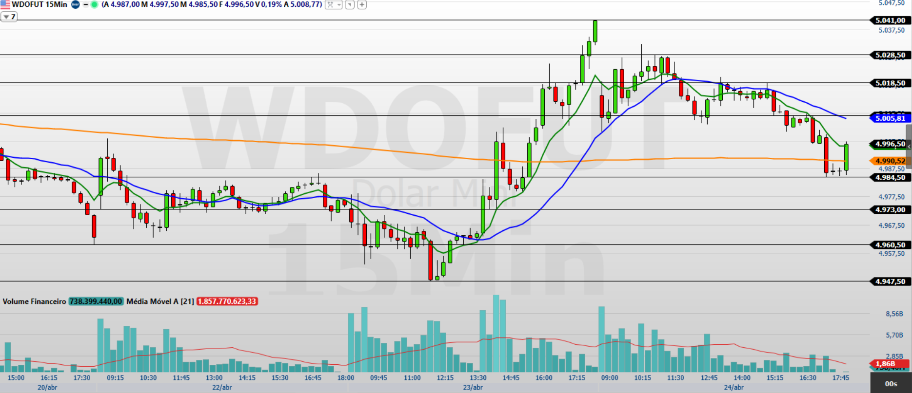 No gráfico de 15 minutos, observo que o minidólar voltou a ceder após duas sessões de recuperação, encerrando o pregão negociando entre as médias móveis de 9 e 21 períodos no gráfico de 15 minutos — um sinal de possível transição, mas ainda com inclinação negativa.