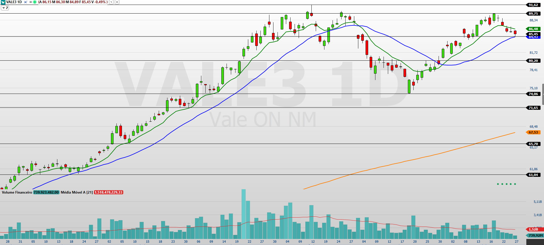 No gráfico semanal, a leitura permanece claramente construtiva. A Vale mantém tendência de alta no médio prazo, sustentada pela negociação acima das médias móveis de 9 e 21 períodos, ambas com inclinação positiva, além da formação consistente de topos e fundos ascendentes.