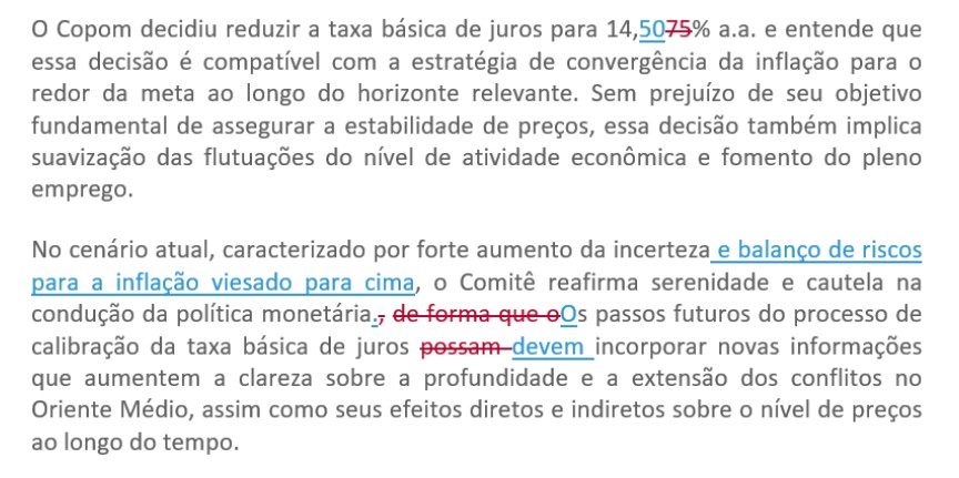 O comunicado deve ter leves alterações para sinalizar essas mudanças e a atenção aos riscos de inflação, como mostra a imagem abaixo: