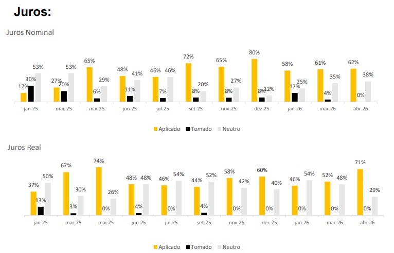 Como reflexo prático dessa expectativa, as carteiras mostram que 62% dos gestores seguem aplicados em juros nominais — ou seja, apostando na queda das taxas —, enquanto as posições tomadas (que ganhariam com a alta) foram completamente zeradas. No segmento de juros reais, 71% também mantêm posições aplicadas.